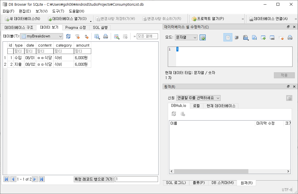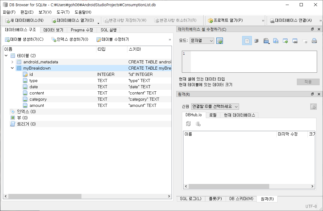myBreakdown은 데이터베이스를 만들 때 설정한 테이블 이름이다. 테이블 안에는 자신이 작성한 column명이 들어있다.