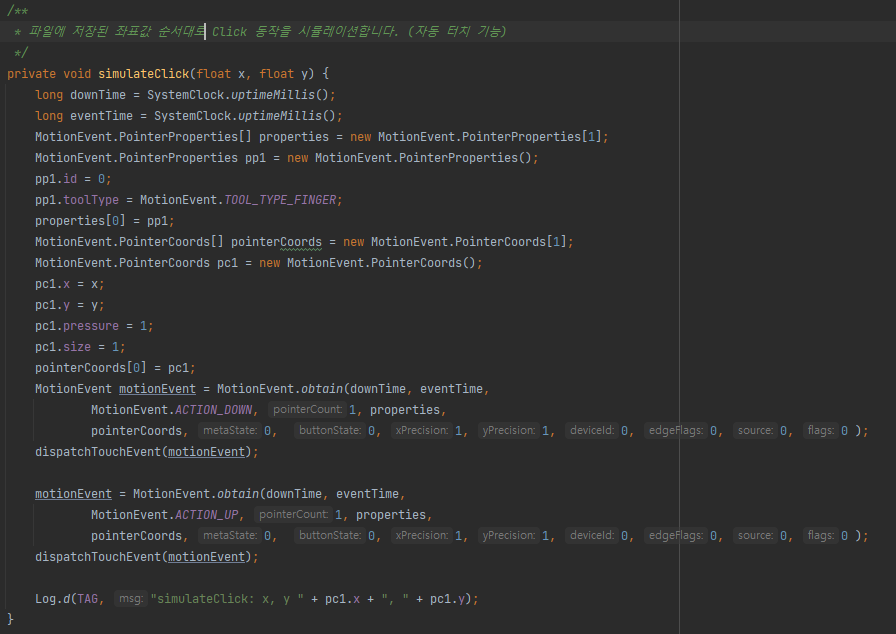 Log.d(TAG, "simulateClick: x, y " + pc1.x + ", " + pc1.y);