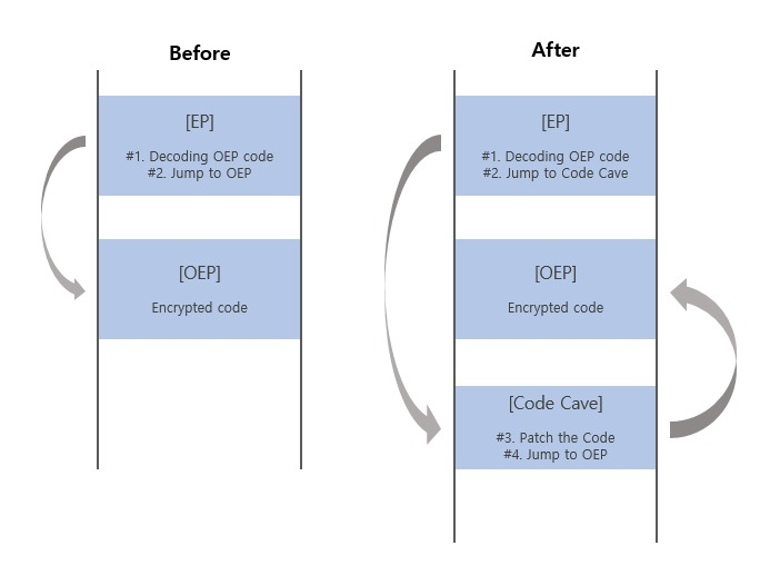 위 그림처럼 EP 코드의 복호화 과정 이후 JMP 명령어를 수정하여 패치코드로 가서 실행시킨 후 OEP로 가는 식이다.