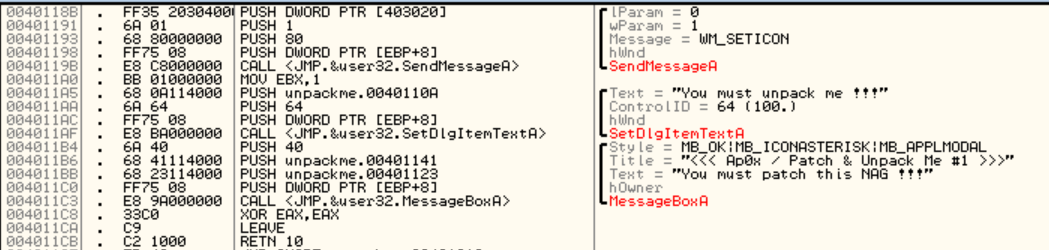 우리의 목적은 위 두 군데의 문자열을 바꾸는 것이다. (가령, You must patch this NAG !!!는 ReverseCore로, You must unpack me !!!는 unpacked로 바꾼다.)