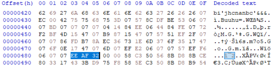 다음과 같이 HxD에서 E9 A8 35를 EE AF 32로 수정한다.