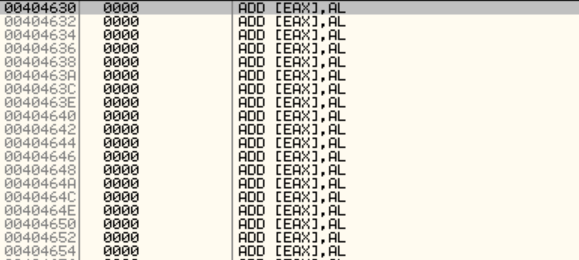 이렇게 NULL 영역의 주소를 구했으니 OllDbg에서 404630으로 가서 확인해본다.