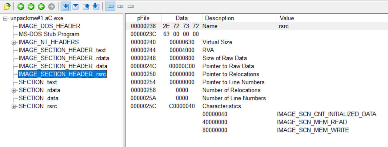 일단 PEView로 파일의 .rsrc 섹션 헤더를 살펴본다.
