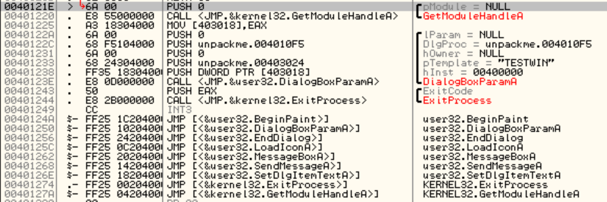 40123E 주소를 보면 다이얼로그를 실행시키는 코드가 함수 명령이 있다. 그리고 40122C 주소를 보면 DIgProc 주소가 4010F5라는 것을 알 수 있다.