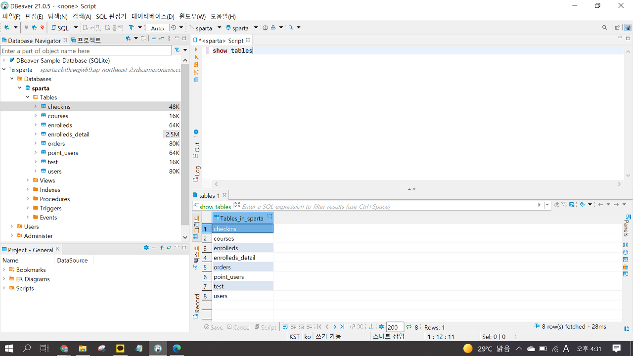 시작에 앞서, 0주차때 설치했던 DBeaver을 열고 'SQL 편집기 열기'(왼쪽 위에 양피지 종이처럼 생긴 아이콘)을 눌러 새 스크립트를 열어준다. 왼쪽에 보면 0주차 때 받았던 sparta 데이터들이 보인다.