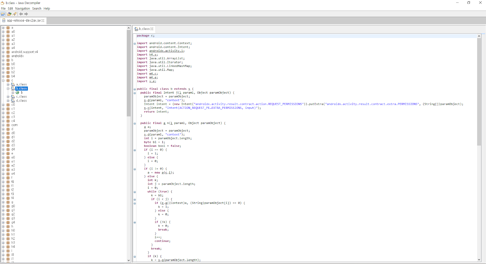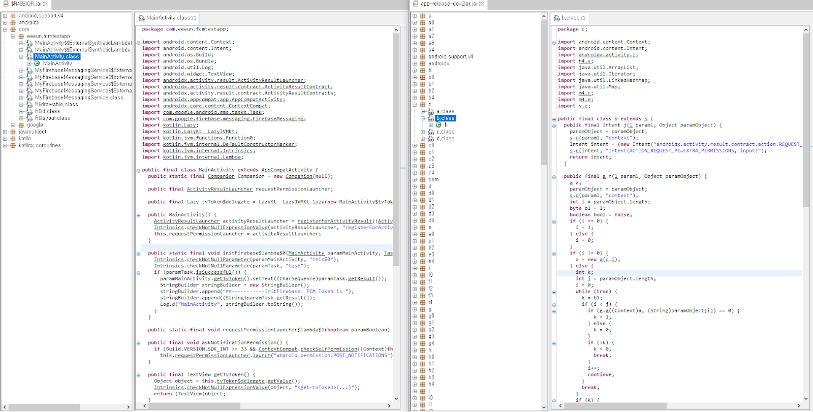 클래스명이 의미없는 알파벳으로 바뀌고, 소스코드 안 변수명들도 모두 의미없는 문자로 변경된 것을 확인할 수 있다.