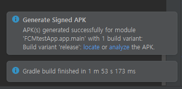 빌드가 완료되면 다음과 같이 APK파일 생성이 완료되었다는 알림이 뜬다. locate을 누르면 해당 폴더를 열어준다.
