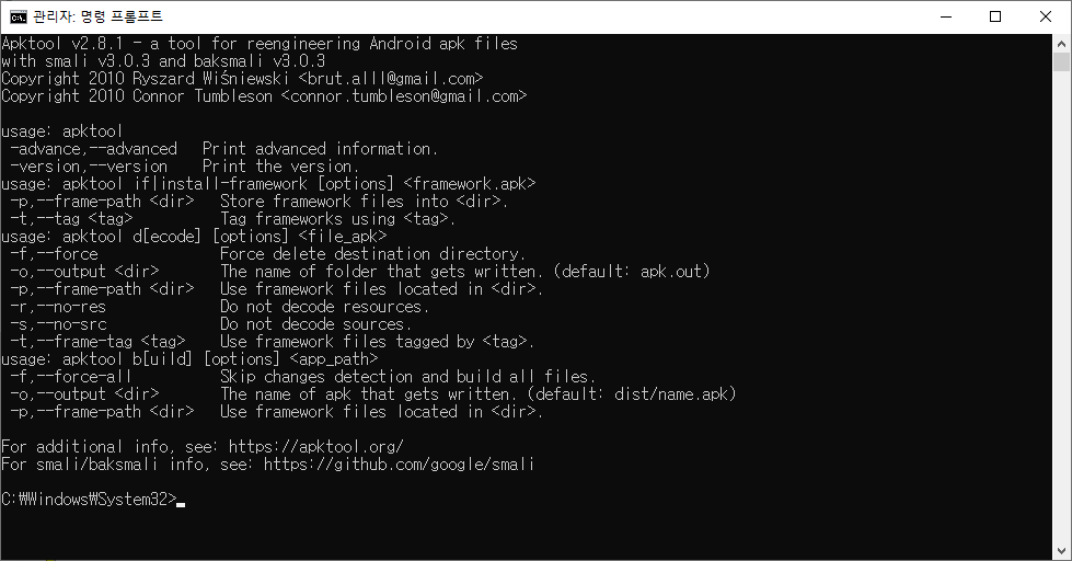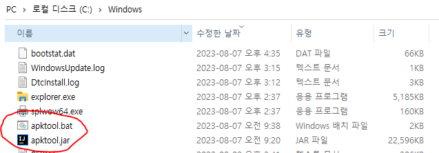 - apktool.bat와 apktool.jar 파일을 C:\Windows 경로에 배치