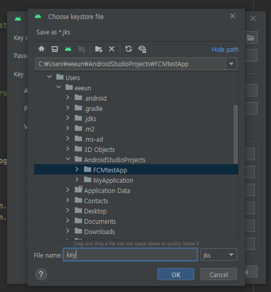 key 경로는 해당 프로젝트 안에 만들어준다.