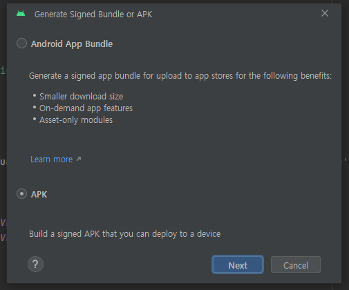 Build -> Generate Signed Bundle or APK를 눌러 진행한다.