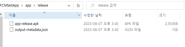 프로젝트 app\release 폴더 안에 apk 파일과 메타데이터가 담긴 json 파일이 생성되었다.