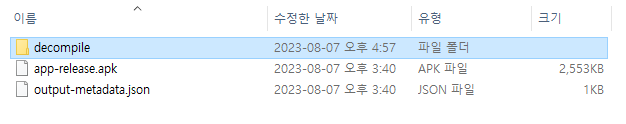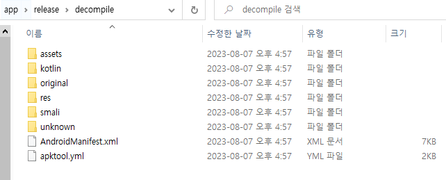 release용 apk파일을 추출했던 폴더로 이동하여 디컴파일을 진행한다.