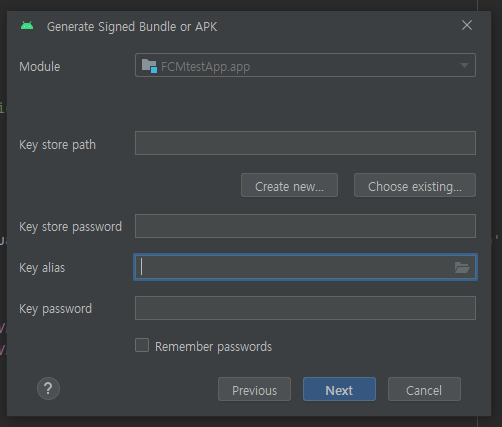 APK 파일을 처음 만드는 과정이라면 key가 없을테니 Create New를 눌러 key를 만들어준다.