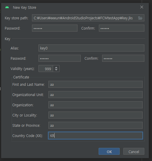 key store와 key의 패스워드를 각각 입력해주고 유효기간을 설정해준 뒤, 내용을 적당히 입력하고(Country Code는 나라코드인데 KR을 입력해준다.) OK를 누른다.