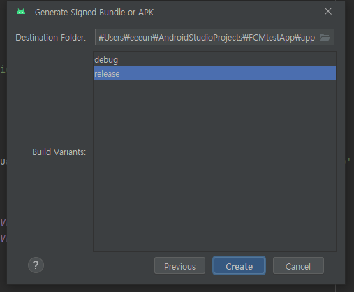 debug와 release 버전 중 release 버전을 선택하고 Create을 누르면 release 버전의 APK 파일이 만들어진다.